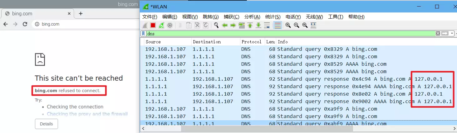 可以看到,这里成功实现了污染,导致树莓派认为 bing.com