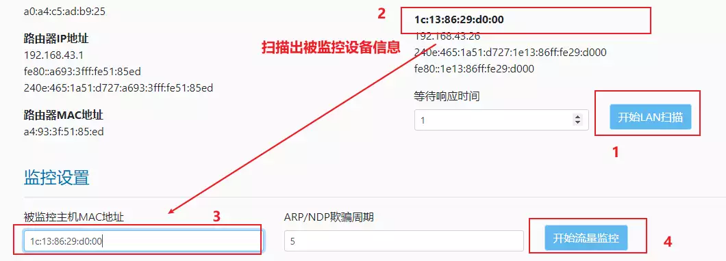 扫描(MAC、IPv4、IPv6)、监控设置(填写被监控主机 MAC